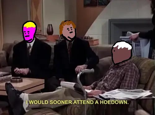 a hoedown is like a room with ten to twenty angry men in it and all of the men are wearing cowboy hats and tattered remnants of what could maybe have been clothes, all the men are screaming and bloody, but they aren’t screaming at each other they are screaming independently of each other, if one of them was removed the screaming would remain the same.