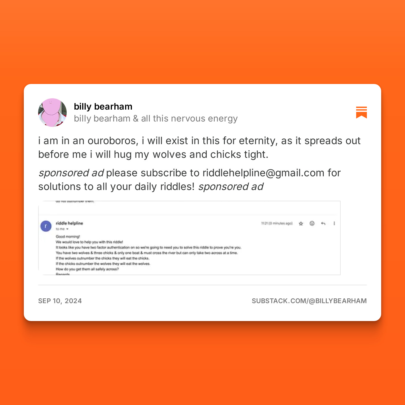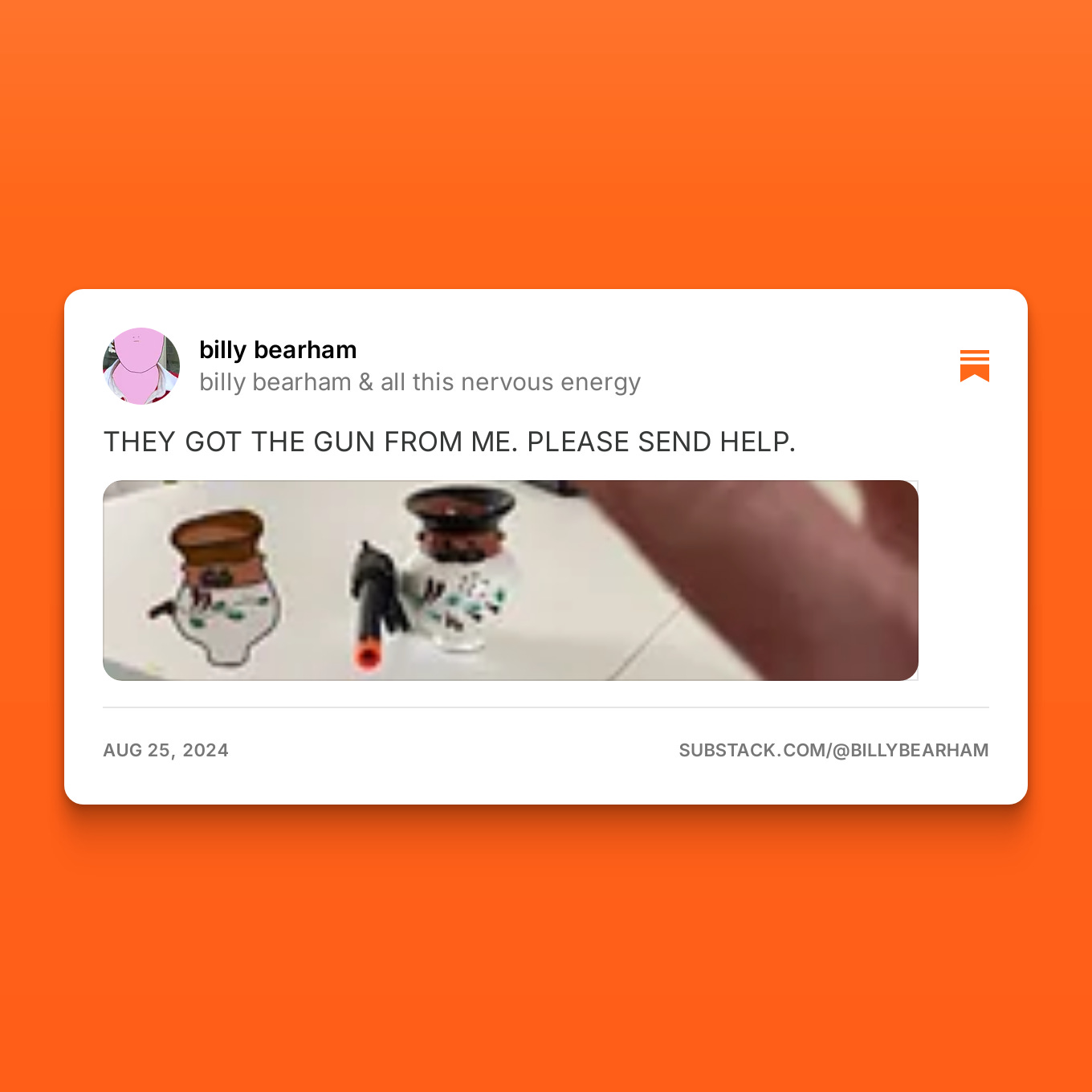 writing is fun! it’s really fun! we live in fucked times & there are so many good people writing the serious things. but this shit i do brings me joy & it turns out i’m good at being dumb, i don’t wanna be serious, i just wanna do this and that fucking rules. you don’t have to make shit that matters for it to matter y’know.